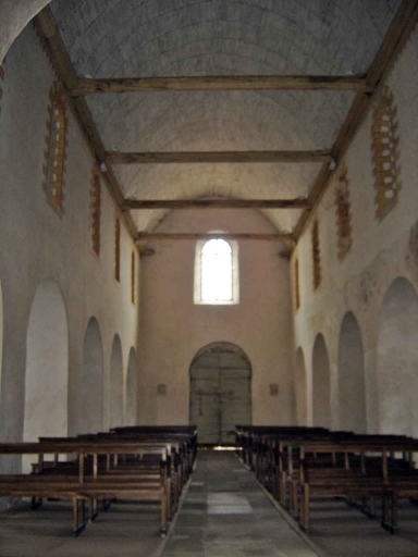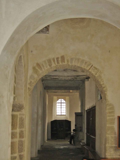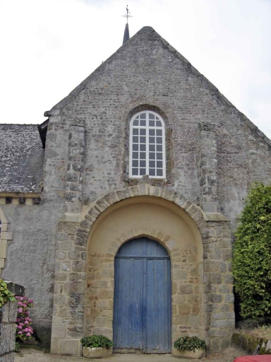 D´après les éléments conservés et les résultats des fouilles entreprises de 1988 à 1990, on peut déterminer que le plan de l´église romane était celui d´un édifice à nef de cinq travées bordée de collatéraux, avec transept peu saillant et choeur à abside et absidioles. La façade occidentale de l´édifice est caractéristique des façades romanes bretonnes : c´est un mur pignon amorti en triangle. Elle possède un portail en arc plein-cintre appareillé à simple rouleau, pris sous un second arc plein-cintre encadré de deux contreforts, formant ainsi un massif en légère saillie sur le mur. Les contreforts appareillés, larges à leur base, sont moins larges et moins saillants dans la partie haute du pignon ; ils se terminent en larmier. Au-dessus du portail, entre les contreforts, est percée une grande baie en arc plein-cintre. Sur le bas-côté nord de l´église, au niveau de la deuxième et troisième travées de nef, ouvre un porche en saillie datant du 15e siècle. Sous ce porche se trouve un accès en arc plein-cintre appareillé qui pourrait avoir existé dès l´époque romane. La croisée du transept est aujourd´hui surmontée d´une tour de plan carré avec flèche en ardoises. Le mur pignon du bras de transept nord conserve dans sa partie inférieure une maçonnerie en opus spicatum de quelques centimètres de hauteur et presque un mètre de longueur. Les soubassements du croisillon sud possèderaient également une maçonnerie de ce type. Le bas-côté sud de la nef conserve la trace d´une des baies primitives, étroite, en arc plein-cintre, qui a été modifiée par la suite. A l´intérieur, la nef, charpentée, possède cinq travées communiquant avec les bas-côtés par une suite d´arcades en plein-cintre reposant sur des piliers carrés massifs. Aujourd´hui l´ensemble est recouvert d´un enduit masquant les éléments architecturaux qui nous intéressent. D´anciens clichés permettent de voir que les arcs à simple rouleau étaient fourrés. On sait également que les piliers ont des arêtes abattues en chanfrein. Au-dessus des arcades étaient percées des baies en arc plein-cintre assez ébrasées, aujourd´hui bouchées. Les bas-côtés de la nef communiquent avec les croisillons du transept par des arcades basses. Le vaisseau central de la nef donne sur la croisée du transept. Celle-ci, de petites dimensions et plan oblong, est couverte d´une voûte en berceau qui repose, à l´Ouest et à l´Est, sur des arcs plein-cintre appareillés dont les retombées se font sur des demi-colonnes engagées dans les piédroits des arcs. Au Sud et au Nord, elle repose sur des arcs plein-cintre beaucoup plus bas et plus étroits donnant sur les croisillons.