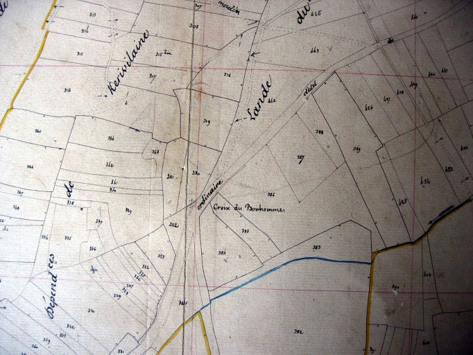 Sur les 18 croix mentionnées par l´abbé Le Tallec dans le bulletin paroissial de Ploemel vers 1970, il n´a été retrouvé que 14 croix monumentales et 1 calvaire, parmi lesquels 10 croix et le calvaire ont fait l´objet d´un dossier de sélection. Il convient d'y ajouter deux croix disparues signalées sur le cadastre ancien de 1845, la croix du Bonhomme et la Grosse croix, dont la disparition est sans doute à mettre à l'actif de l'aménagement des routes aux 19e et 20e siècles ; le plan du bourg dressé en 1878 signale également une croix face à la maison d´école de filles, sans doute la croix Méen qui a donné son nom au lieu-dit, alias la Groëz Ven remontée dans le monument du Quiniec. L'abbé Collet mentionne à 300 m. à l'est de Saint-Laurent, une croix de pierre face à un menhir penché. D'autres, telles les croix de Kerran ou de Kerbrézel, ont été mutilées ou brisées lors de déplacements successifs. Le chanoine Danigo signale la Croix Doré sur la route d'Auray à Belz, datée 1751, aujourd'hui déplacée sur la route de Mendon. Le corpus actuel est donc fragmentaire et parfois dénaturé avec des périodes qui s'échelonnent du haut Moyen Âge au début du 20e siècle. Sept de ces croix sont isolées en bordure de chemin. L'une d'entre elles marque la limite paroissiale au nord de Coëtquintin (fig. 8). Trois croix situées dans des hameaux accompagnaient des chapelles, disparues pour les chapelles de Saint-Michel à Locmiquel et Saint-Goal à Kergal, encore existante à Locmaria. Quant au calvaire, déplacé dans le cimetière actuel, il était autrefois dans le cimetière autour de l'église, accompagné d'une autre croix qui ne semble pas pouvoir être celle aujourd'hui conservée au chevet de l'église.