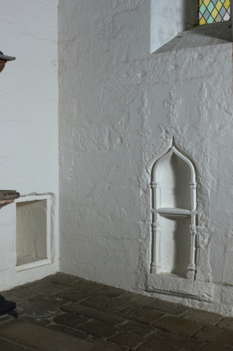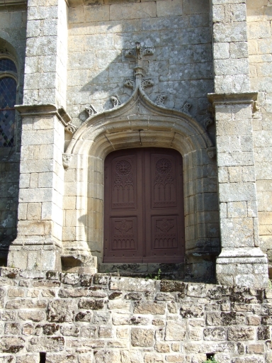 Porte ouest : archivolte surmontée d'un fleuron, reposant sur deux culots orné l'un d'un chien, le second d'un acrobate, la tête entre les jambes. Porte sud : archivolte surmontée d'un fleuron, reposant sur deux culots orné de visages. Sur la sablière nord, le phylactère est tenu par un angelot.
