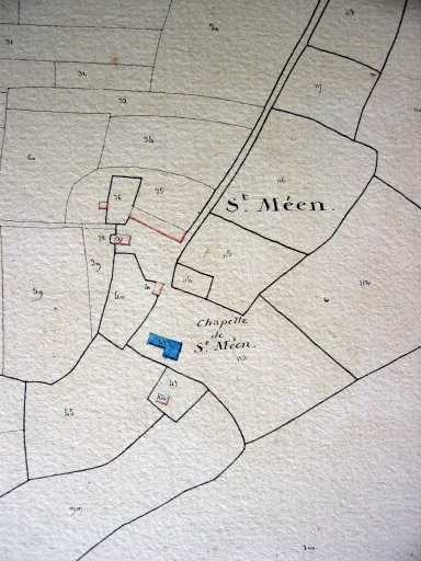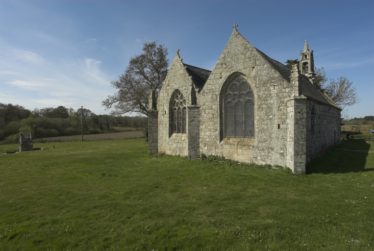 La tradition rapporte que la chapelle saint- Méen aurait été fondée par les templiers, affirmation non avérée. Elle a été construite en deux campagnes très proches dans la première moitié du 16e siècle : la nef, puis la chapelle sud qui s'est greffée peu après sur la nef : une petite différence de modénature entre les portes de la nef et celle de la chapelle accrédite l'idée que cette dernière est un peu postérieure. La verrière du chevet datée 1556 date la fin de la construction. Elle porte le blason de la famille de Larlan, seigneurs de la terre noble proche de Coët Quintin, qui sont les prééminenciers et sans doute les fondateurs de la chapelle. D'autres blasons figurent dans la chapelle : sur la fenêtre nord du choeur, un blason buché non lu, peut-être une croix comme sur les trois blasons sculptés sur le devant d'autel, également la famille de Larlan qui porte 'd'argent à la croix de sable chargée de neuf mâcles d'argent'. Menaçant ruines, le clocher a été démonté en 1838 et remonté sans doute à l'identique ou en remployant les pierres anciennes car il paraît dater du 16e siècle. C'est à la même époque que le recteur Guyonvarc'h fait démonter le jubé de bois jugé encombrant. Les remplages des fenêtres nord et sud ont disparu.