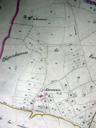 Hameau très isolé dans un environnement de lande au nord-ouest de la commune, Kervernic était en 1811 divisé en deux parties et traversé autrefois par la route reliant Auray à Belz et au Port-Louis, route dont le tracé fut modifié vers 1845. La partie nord comptait deux fermes et des petites dépendances dont un fournil, ainsi qu'une maison plus isolé au sud ; la partie sud comprenait un alignement de plusieurs propriétés, des dépendances, plusieurs petits bâtiments en ruines et une ferme isolée au sud immédiat de la route. A proximité de l'alignement et de cette ferme, un enclos de forme presque carrée bordé de murs et de deux dépendances pourrait être l'aire à battre. En 1845, si la physionomie de la partie nord n'a pas changé, il n'en est pas de même de la partie sud : l'extrémité ouest du grand alignement est en ruines tandis que s'est construite une nouvelle unité d'habitation vers le nord-est. Aujourd'hui, il ne reste qu'une partie du grand alignement construit ou rebâti au milieu du 19e siècle et restauré au 20e siècle. De la partie nord, rien n'a subsisté car en 1898, M. Guennec, un des propriétaires du grand bazar d'Angers nommé 'le palais des marchands' fit construire à la place des anciens bâtiments une ferme modèle comprenant une fromagerie. Cette dernière n'a pu être étudiée lors de l'enquête.