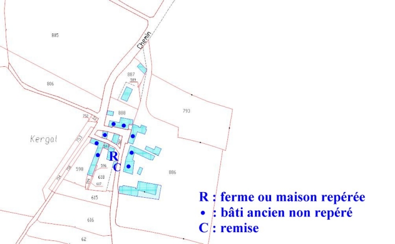 Le village était desservi par un chemin nord-sud menant à Locmaria, sur lequel s'articule un chemin de desserte est ouest, puis nord-sud. Plusieurs fermes se déploient sur un plan en équerre, dont celle au sud-ouest formée d'un regroupement de petites parcelles. Seule une maison est repérée : en moellon, il s'agit d'un logis à deux pièces. Remise-fournil en moellon avec ouverture en pignon à porte charretière à linteau de bois. Le sommet du pignon est orné d'une croix. Un puits circulaire est adossé au mur d'enclos.