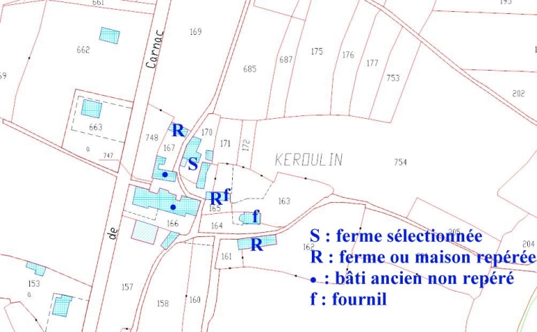 Le village est desservi par l'ancien chemin du Bourg à Carnac, conservé et bordé de murets, l'itinéraire actuel (D 119) passant plus à l'ouest. Un ancien chemin de desserte perpendiculaire le relie à la nouvelle route. Les logis sont tous orientés au sud. Au centre, le logis avec fournil se compose d'une pièce unique et peut-être d'un cellier dans lequel se trouve l'ouverture du four. La cheminée est en bois. Au sud, l'alignement remanié ouvert au nord appartenait au type logis-étable à deux portes ; la salle conserve une cheminée à colonnettes dont l'origine est inconnue. A l'est du chemin ancien, ferme enclose regroupant un logis en moellon à deux pièces avec dépendance en retour, crèche isolée et grange à porte charretière en pignon. A l'ouest du chemin, la dernière ferme remaniée conserve au fond de la parcelle une dépendance avec cellier.