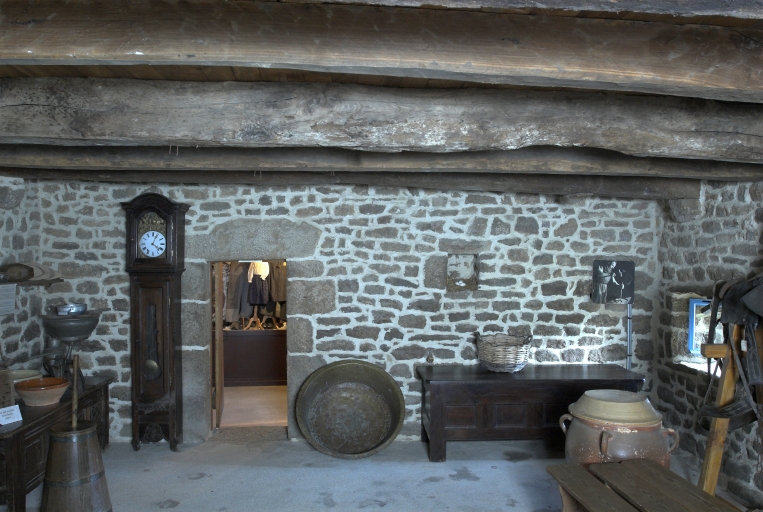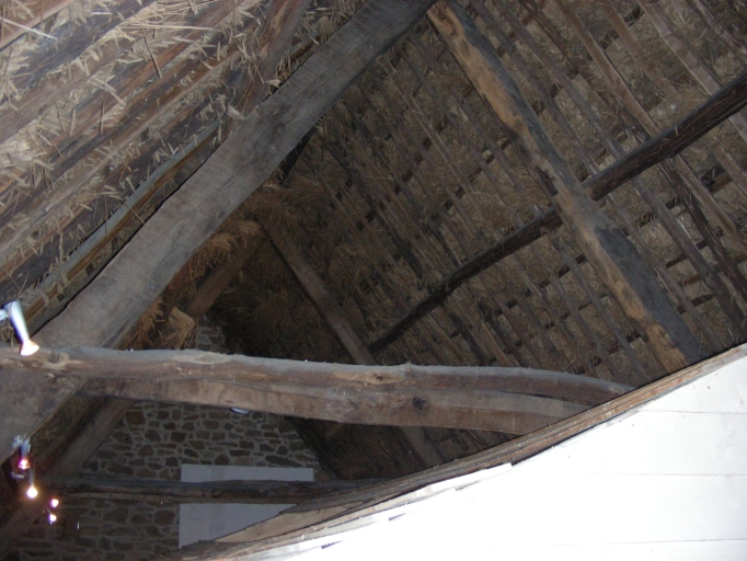Ferme de type logis étable, dont la salle à l'ouest est séparée de la partie étable par une marche. Face à la porte qui donne dans l'étable, l'escalier en pierre dans une tour en demi-hors-oeuvre dessert le grenier. La cheminée au pignon ouest est engagée, deux consoles grossièrement moulurées en quart de rond supportant montants et linteau de bois. Une partie de l'étable contre le mur sud, correspondant à la place du cheval, est dallée, un muret en demi-hauteur servant de mangeoire séparant la stalle de l'entrée. Dans le mur nord sont creusées deux niches à poules, à proximité de la porte de communication avec la laiterie. La charpente est typique d'une charpente de chaume, avec arbalétriers croisés, faux-entrait.