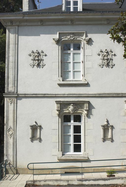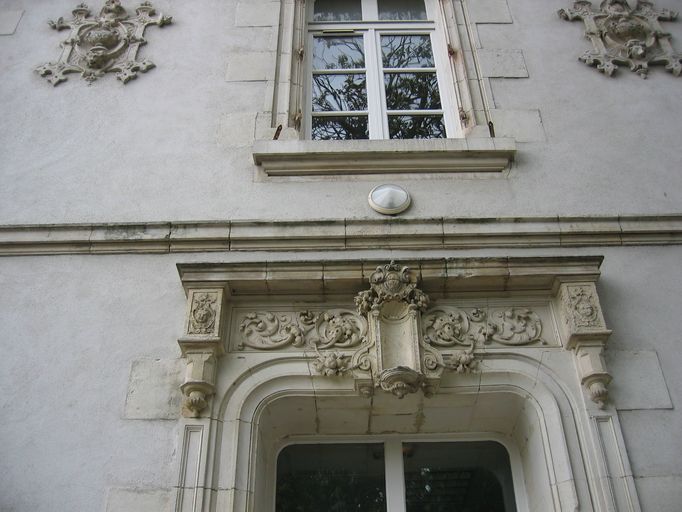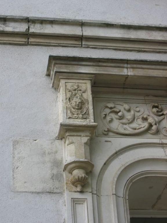 Encadrement des ouvertures de la façade sur rue en pierre calcaire sculptée de têtes d'animaux, de coquilles, de décor végétal, de fruits et de chérubins. Eléments de décors sculptés apposés sur la façade entre les fenêtres. Les fenêtres percées dans les conduits de cheminée au niveau du comble sont bordées d'un balcon en ferronnerie.
