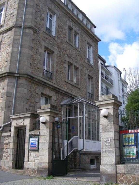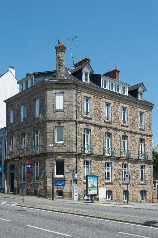 En pendant de l'immeuble de la Société Générale qui occupe l'angle nord-ouest, cet immeuble fait preuve de plus grande qualité avec le traitement du pan coupé et de la travée de la porte d'entrée sur la rue Thiers en pierre de taille de granite. Pourtant, les différences avec le projet initialement prévu sont notables, l'utilisation de la pierre de taille étant réduite : soubassement et rez-de-chaussée devaient être à bossages. Les lucarnes en pierre à fronton curviligne ont été remplacés par des lucarnes en bois. Un balcon filant devait orner le 1er étage, et les clefs d'arc des ouvertures devaient être sculptées de feuillages et de motifs rocailles tandis que la souche de cheminée d'angle était encadrée de volutes. Ce programme ambitieux fut sans doute réduit en raison de difficultés économiques.