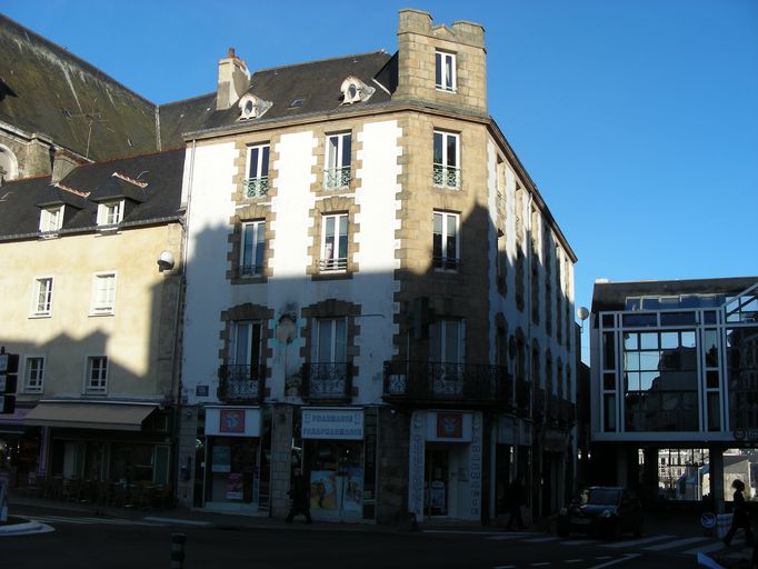 L'immeuble occupe une large parcelle d'angle d'origine médiévale, dont le pan coupé ne suit pas les préconisations du plan d'alignement de 1841 qui prévoyait le recoupement des façades des n°26 et 22 et de la parcelle d'angle sur la place et sur la rue du Mené. L'accent est mis sur le pan coupé en pierre de taille surmonté d'une lucarne encadrée de souches de cheminées polygonales, qui rappellent celles des immeubles à pan coupé de la place de la République. Les autres élévations sont enduites. L'accès à l'immeuble se fait par la rue Le Brix. Sur le côté nord, un passage cocher en partie bouché côté nord mène à une remise écurie dans une cour en contrebas, ainsi qu'à un entrepôt dénommé hangar à bouchons sur le plan de 1904. Sur une seconde cour est édifiée un logis enduit à un étage carré.