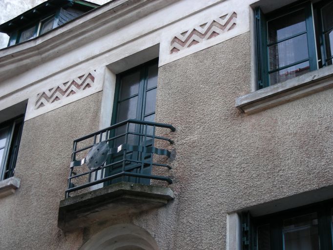 Tympan de la porte orné d'un vase de fleurs en ciment moulé ; bouclier celte en ferronnerie aux balcons ; bandeau de façade avec décor géométrique.