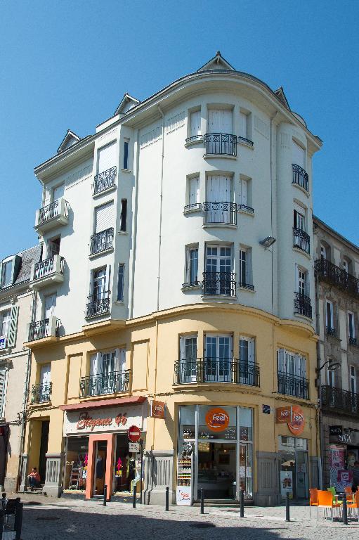 Immeuble de rapport implanté en alignement à l'angle des rues Billault et Le Brix à plan double en profondeur sur une parcelle très petite. L'immeuble est en moellon de granite entièrement enduit. Sa façade est fortement structurée, verticalement par le pan arrondi à l'angle et par deux oriels sur chacune des façades, l'un à côtés arrondis rue Le Brix, le second à pans obliques rue Billault. Le premier étage bien que de hauteur équivalente aux autres est traité comme un étage entresolé, par la présence d'un épais bandeau qui le sépare des étages supérieurs, séparation aujourd'hui accentuée par la différence de couleur de l'enduit de revêtement. En grande partie mitoyennes, les élévations postérieures n'ont aucune fenêtre.