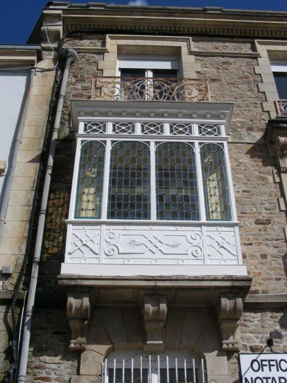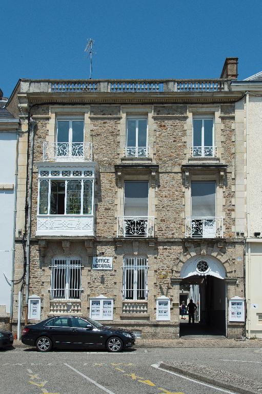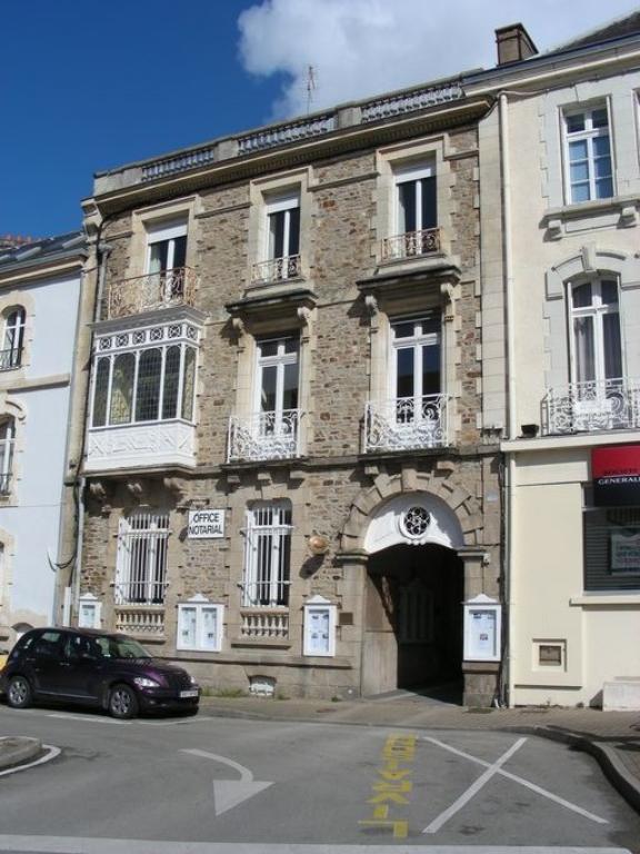 Maison très cossue à plan double en profondeur construite en alignement de rue. Elle montre une élévation à travées de 2 étages carrés sur sous-sol, surmonté d'un étage de comble en retrait qui s'ouvre sur une terrasse à balustres. Un porche d'entrée sur la place dessert de part et d'autre la maison dont l'entrée est latérale postérieure, et les écuries dans le jardin. L'escalier est postérieur en hors-oeuvre. La pierre de taille de granite est utilisée pour le porche à bossage, les encadrements des ouvertures du rez-de-chaussée et le soubassement, la pierre calcaire réservée à celles des étages et aux balustres des gardes corps et de la terrasse. La totalité de la maison était enduite. Les ouvertures du premier étage sont surmontées par des impostes à larmier. La travée latérale ouest est soulignée par un oriel vitré supporté par d'épaisses volutes.