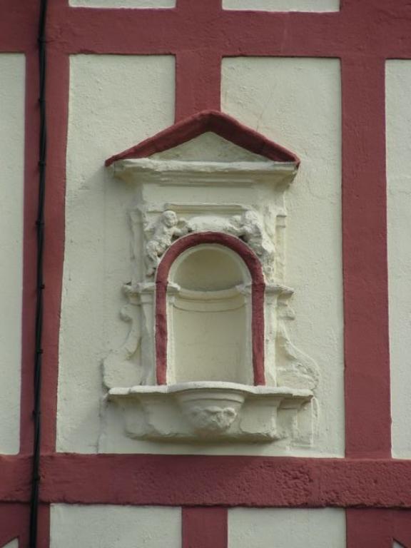 Niche à saint en plein cintre surmontée d'un fronton triangulaire et encadrée de deux angelots et de volutes. Gardes-corps des ouvertures du 1er étage en fer forgé.
