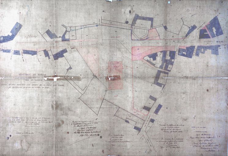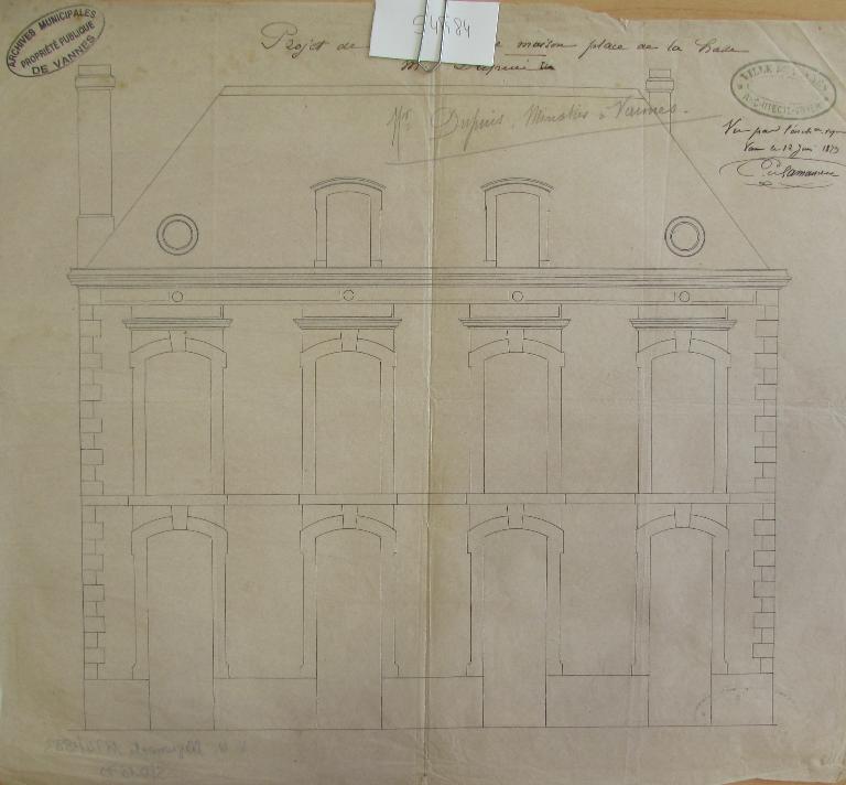 A. M. Vannes. 35W. Etat actuel de la propriété des Assurances sociales agricoles avant travaux ; plans du rez-de-chaussée et du 1er étage ; plan du 2ème étage des bureaux ; coupe, façade sur rue et façade sud des bureaux par Guy Caubert de Cléry, 19 novembre 1951.