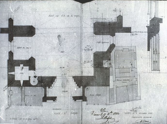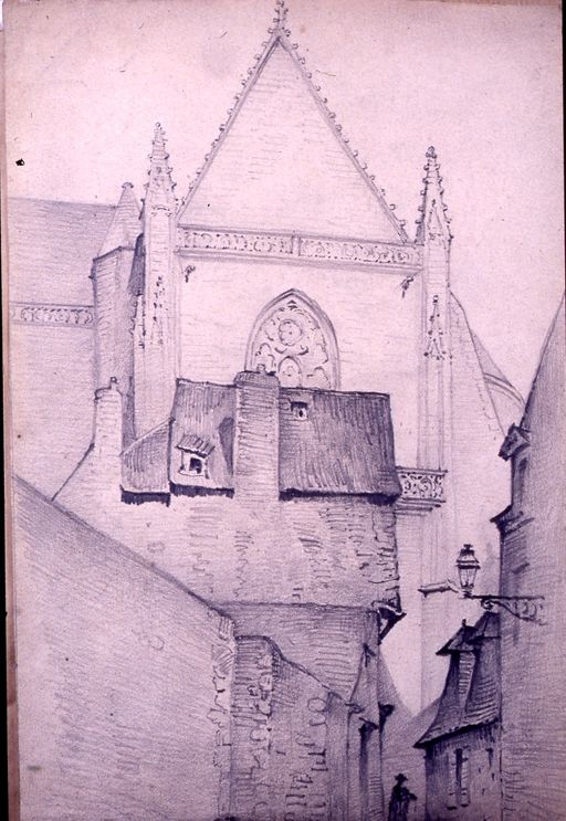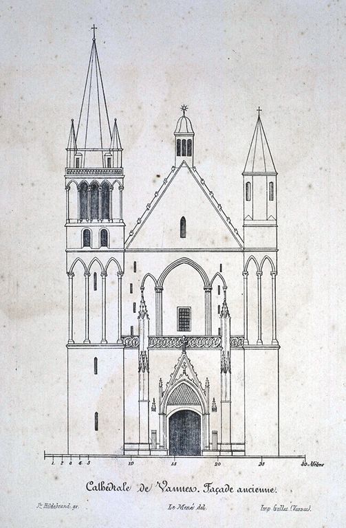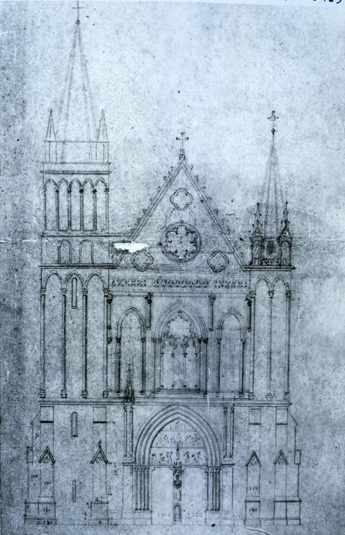 En 1866, reprenant un projet de Brunet-Debaisnes, M. Charier propose de doter la cathédrale d´une façade harmonique de son invention, dans le style gothique rayonnant, en enrobant complètement la tour nord de maçonneries neuves et en lui donnant une symétrique au sud. À la demande de Labrouste, inspecteur général des édifices diocésains, c´est une solution moins radicale qui est finalement retenue, puisqu´elle respecte les dispositions anciennes de la tour nord, mais le reste du frontispice est une création intégrale du XIXe siècle. Plusieurs relevés datant de 1862 permettent néanmoins de connaître l´état antérieur de la façade, dont les parties basses des tours étaient du reste dissimulées par des constructions civiles à pans de bois. Au-dessus, soit au second registre, apparaissent au nord trois arcades en tiers-point retombant sur d´élégantes colonnes par l´intermédiaire de chapiteaux à crochets. Les deux étages supérieurs de la tour étaient respectivement éclairés par deux baies en plein-cintre séparées par un trumeau et par trois baies en tiers-point encadrées par deux arcades aveugles. Au-dessus, s´élevait une flèche octogonale haute de quelque 23 m, éclairée par quatre lucarnes et cantonnée de quatre clochetons d´angle – les quatre fillettes et petites tourelles, qui sont au cerne du grand aguillon d´iceluy clocher , mentionnées par une expertise de 1536.
