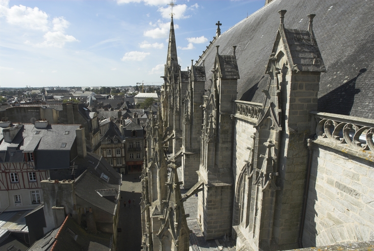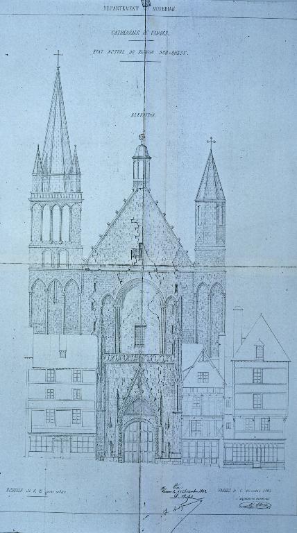 La tradition attribue à l´évêque Judicaël (991-1037) et à son frère le duc Geoffroy, dans le premier tiers du XIe siècle, la reconstruction de l´ancienne cathédrale de Vannes, sise sur la colline du Mené, au centre de la cité fortifiée gallo-romaine, et détruite par les Normands en 919. Mais le chœur qui subsista jusqu´en 1770, connu par un bel ensemble de plans, coupes et élévations dressés au XVIIIe siècle, correspond à un édifice plus récent, sans doute de la fin du XIIe siècle. Avec son déambulatoire à trois chapelles rayonnantes, son élévation à trois niveaux – grandes arcades, arcature aveugle, fenêtres hautes – où coexistent arcs brisés et plein-cintre, elle évoque les églises du Maine (Notre-Dame d´Avesnières à Laval, Notre-Dame-du-Pré au Mans), ainsi qu´A. Mussat l´a justement observé. C´est probablement sous l´épiscopat de Guéthénoc (1182-1220) qu´est construite la façade ouest.