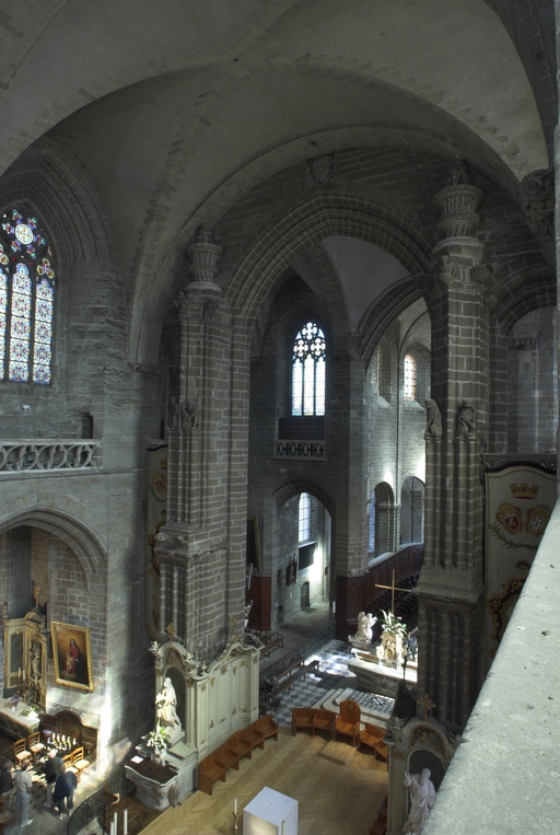 La nef était-elle prévue dès l´origine pour être voûtée ? Un faisceau de présomptions incite à répondre par l´affirmative : sa largeur, somme toute modeste par rapport aux plus grands vaisseaux languedociens et catalans, qui avoisinent ou dépassent 20 m, l´importance des contreforts, l´existence d´arcs-boutants – certes très minces – et d´un arc formeret au-dessus de l´arc triomphal. De plus, les relevés du XVIIIe siècle montrent clairement des départs de voûtes, tant dans la nef que dans le transept. Enfin, la structure s´est révélée parfaitement apte, sans subir de modifications, à porter les massives voûtes d´arêtes lancées en 1768. L´intention de voûter le transept est encore plus évidente, comme en témoigne la présence de colonnes engagées dans les angles sud-est et sud-ouest du bras sud – identiques à celles qu´on voit au même emplacement à Notre-Dame de Quelven –, de dosserets et de traces de formerets, bûchés au XVIIIe siècle, mais bien apparents dans le bras nord. Quoi qu´il en soit, la mise en place des voûtes classiques, plus écrasées que ne l´eussent été des croisées d´ogives, a considérablement modifié la perception du volume du grand vaisseau, dont le lambris du XVIIe siècle est situé une dizaine de mètres plus haut.