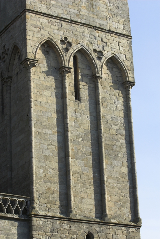 La partie centrale, au même niveau, comprenait une grande baie (qui apparaît murée, mais divisée en deux lancettes sur un relevé de 1824) dont l´arc à peine brisé tend vers le plein-cintre, encadrée de deux arcades aveugles plus basses en tiers-point. La tour sud n´est en fait qu´une tourelle de plan carré, couronnée par un étage et une flèche de pierre octogonaux, dont la seule fonction est d´abriter un escalier en vis. Son premier étage est allégé par deux arcades aveugles en tiers-point, moins larges que celles du nord. Exception faite de la dissymétrie des tours, cette façade présente d´évidentes ressemblances, soulignées par L. de Farcy dès 1886, avec celle de la cathédrale d´Angers, datée des années 1180, qui fit également école au Puy-Notre-Dame. Toutefois, on peut y déceler quelques influences du décor normand, dans les motifs en décaissement de trilobes et de quadrilobes qui allègent les arcades et les écoinçons du premier étage.