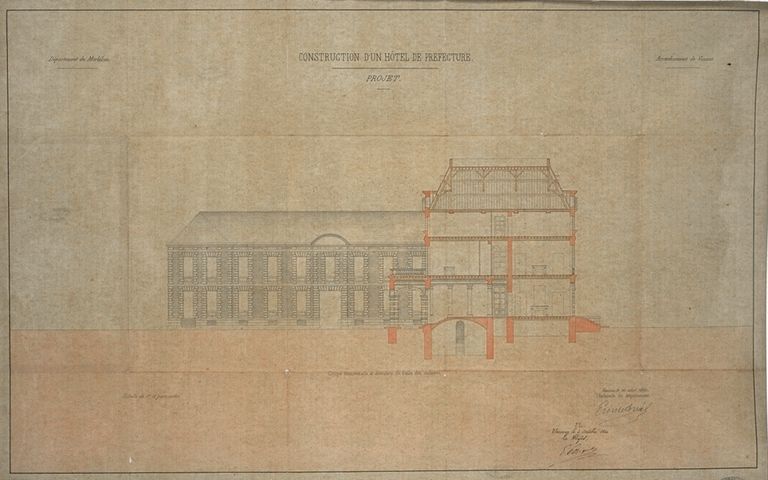 A. D. Morbihan 1Fi 698. 1860. Construction d'un hôtel de préfecture. Projet. Coupe transversale par Emile Amé, architecte, 10 Août 1860.