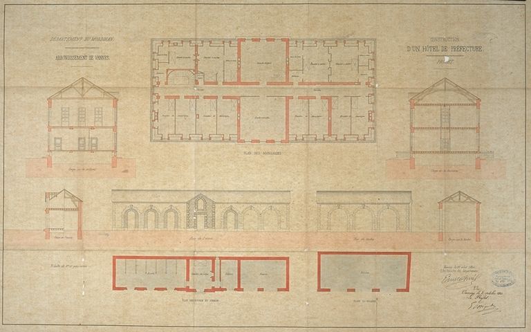 A. D. Morbihan 1Fi 695. 1860. Construction d'un hôtel de préfecture. Projet. Plan du rez-de-chaussée par Emile Amé, 10 Août 1860.