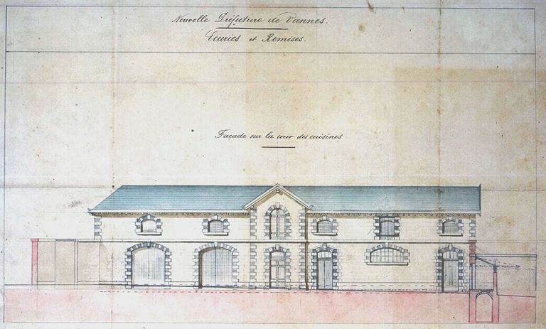 A. D. Vannes 1 Fi 314/2. Préfecture de Vannes. Ecuries et remises, plan, façade sur la cour des cuisines par Narotte, architecte, 15 mai 1864.