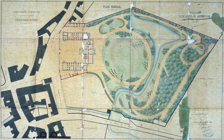 A. D. Morbihan 1Fi 694. 1860. Construction d'un hôtel de préfecture. Projet. Plan général par Emile Amé, architecte, 10 août 1860.