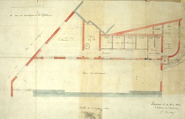 A. D. Morbihan 1Fi 697. 1860. Construction d'un hôtel de préfecture. Projet. Plan des écuries et des mansardes par Emile Amé, architecte, 10 Août 1860.