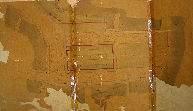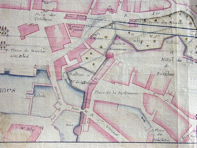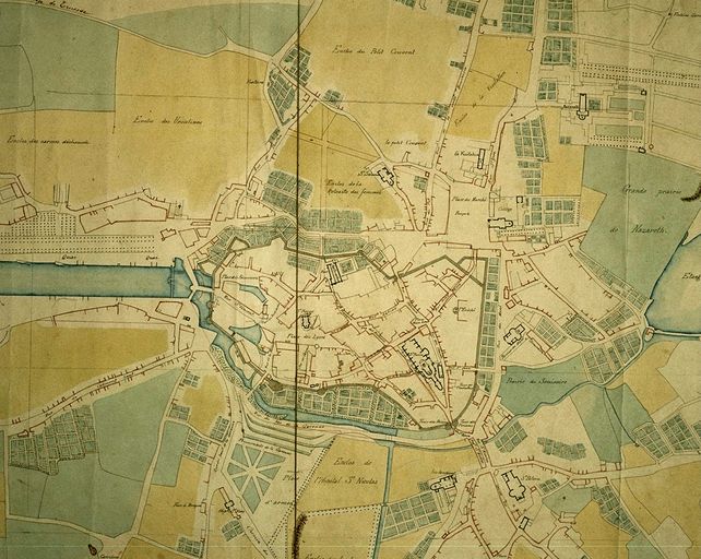 A. D. Morbihan. 1 Fi 88/1. Vannes en 1785, avec indication des alignements projetés. Copie. Dessin : plan, 1785.