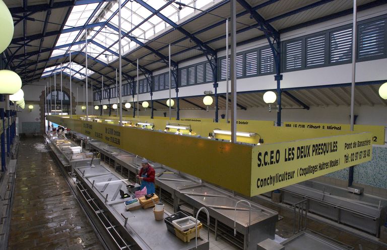 Edifice formant îlot sur l'ancienne place de la poissonnerie. La halle est de plan rectangulaire avec travée centrale et bas-côtés de moindre hauteur sous appentis. L'éclairage et la ventilation sont assurés par un lanterneau à l'origine vitré installé au-dessus de la travée centrale, en plus des persiennes latérales ajourées à lamelles fixes situées entre la partie supérieure de la nef et la partie inférieure des bas-côtés. La charpente de la nef et des bas-côtés est supportée de chaque côté par une ossature métallique. La couverture est en zinc. Les élévations possèdent un parement enduit sur un soubassement en pierre de taille de granite avec chaînages d'angles. L'entrée de la poissonnerie s'effectue par les murs pignons dont ceux de la nef sont en légère saillie sur ceux des bas-côtés. Les portes en plein cintre sont fermées par des grilles. L'intérieur de la halle est divisée en trois travées desservies par deux allées latérales, deux latérales sous les bas-côtés pour les marchandes de poissons et une partie centrale affectée à l'époque aux marchandes de coquillages.