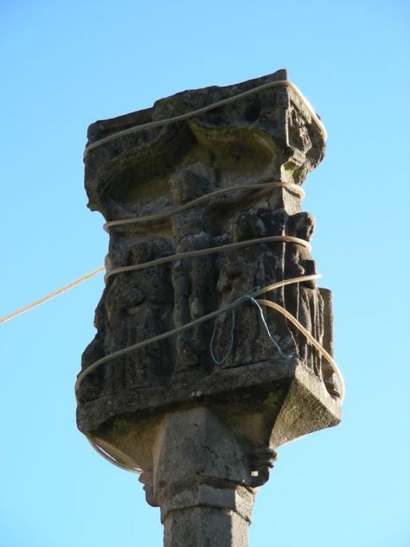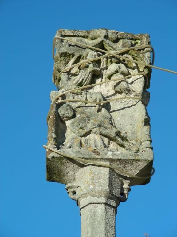 Les croix à tableaux des 15e et 16e siècles sont fréquentes en Morbihan, mais les tableaux revêtent des formes diverses : en quadrilobe, en bâtière, et rarement sous cette forme rectangulaire ici accentuée par la disparition des colonnettes d'angle. On la retrouve cependant intacte à Séné sur la croix de Montsarrac, peut-être du même auteur.