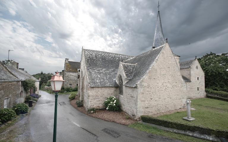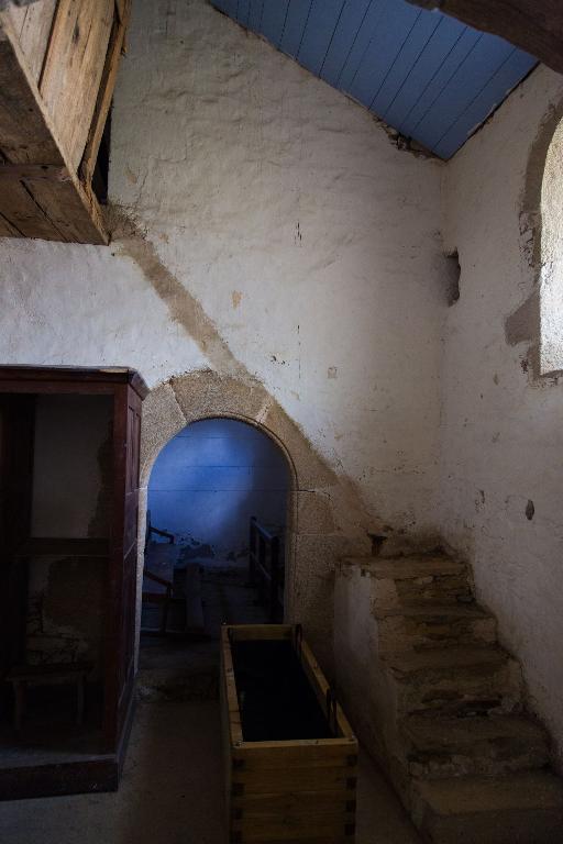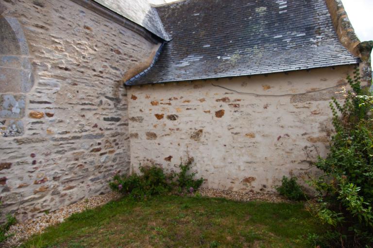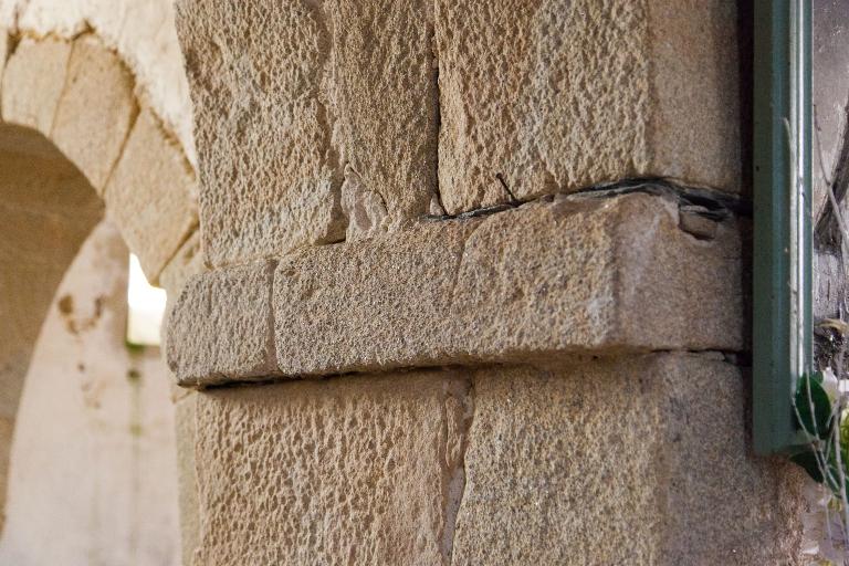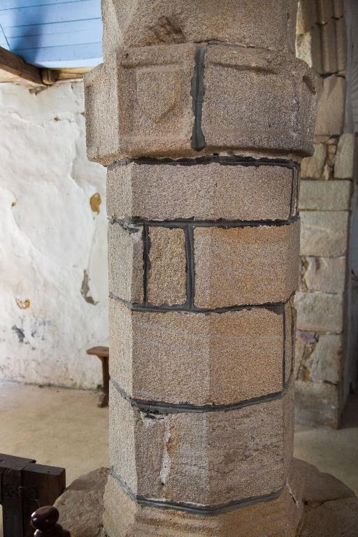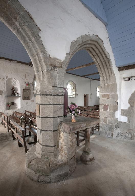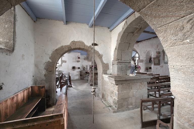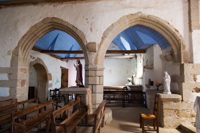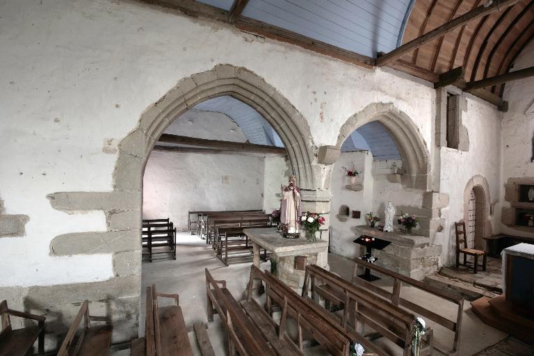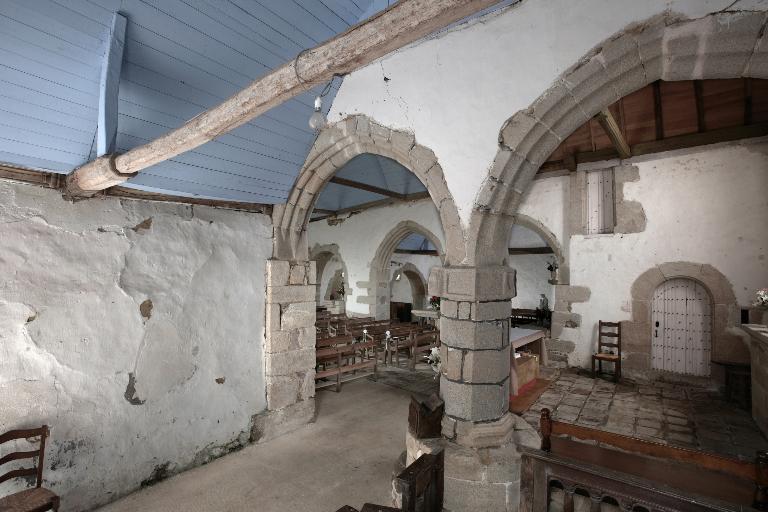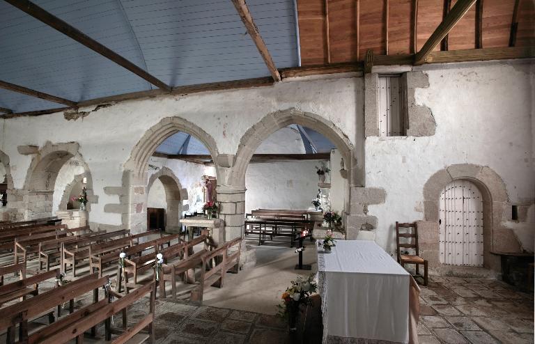 À l’intérieur, la nef est presqu’entièrement badigeonnée, mais quelques sondages ont permis de mettre à jour des fragments de peintures murales ocres, grisâtres et jaunes. L’église est partagée en quatre travées au nord et deux au sud. Les deux premières travées communiquent avec le bas-côté nord, elles sont marquées par deux arcades romanes en berceau séparées d’une pile quadrangulaire. Si la première voûte retombe sur deux impostes en saillie sans modénature, la seconde est reçue par deux impostes en cavet. Les travées du bas-côté sont distribuées par deux autres arcades en berceau dont la maçonnerie indique une construction asynchrone entre ces deux arcades et celles communiquant avec la nef. Le départ d’un escalier menant à la tribune en bois qui surplombe l’entrée de la nef se devine encore sur le gouttereau occidental du bas-côté. Les deux dernières travées ont été remaniées au début du XVIIe siècle comme l’indique la date 1612 portée sur la pile octogonale qui soutient les arcades de la chapelle nord. Pendant ces travaux, il semblerait que les arcades ont été remontées dans un style singulier ne correspondant pas à l’ordonnance initiale. Les deux premières arcades des deux chapelles formant transept sont en arc brisé à multiples voussures toriques, alors que les secondes arcades, plus simples, sont à voussures doubles pénétrant les piliers engagés des gouttereaux de la nef. Notons que les sommiers de la quatrième arcade au nord et des deux arcades au sud sont d’une largeur moindre que le mur qui les soutient. Au nord et au sud, les deux séries d’arcades reposent sur un pilier octogonal dont l’imposante base cylindrique sert d’assises de fondation. Le pilier au nord-est simplement souligné d’un listel tandis qu’au sud, sa base est ornée d’une gorge moulurée, et d’un chapiteau frappé d’un écu à l’est et d’un bas-relief au sud. Ce dernier représente une femme coiffée d’un voile et d’un gorget rappelant la mode du bas Moyen-Âge. Enfin, le chœur a été fortement remanié lors des travaux du XVIIe siècle comme l’indique le style des crédences et des niches qui encadrent la maitresse-vitre.