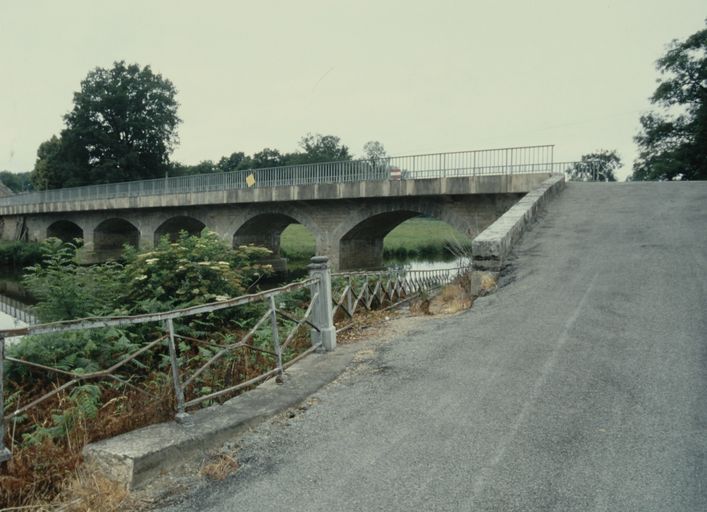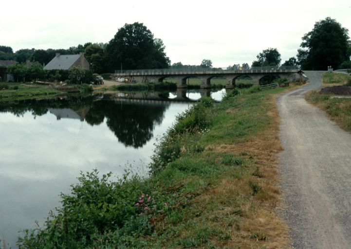 Pont à cinq arches en arc surbaissé dont l'une au-dessus du chemin de halage ; culées & piles à becs semi-circulaires : moellon de granite, chaînes d'angle : pierre de taille de granite. État actuel : tablier débordant : béton, garde-corps métallique ; traces de cordage. Chemin de halage non accessible : pavage maçonné, garde-corps métallique. Ponton en aluminium et bois en aval.