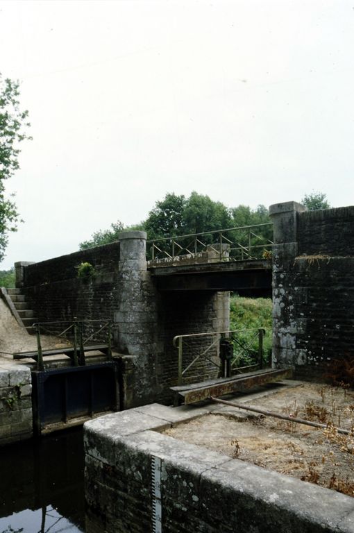 Écluse sans sas ; petit appareil de schiste, parements supérieurs & chaînes d'angle : pierre de taille de granite. Déversoir rectiligne. Trois vannes anciennes ; culée et îlot : pierre de taille de granite, vannes : bois. Borne kilométrique en trois éléments ; H = 125. Ponceau de halage. NB : Une écluse de garde est placée sur la dérivation d'une rivière (ici l'Oust) pour protéger cette dérivation en cas de crue de la rivière ; elle laisse le passage libre en temps normal ; au-dessus d'un certain niveau de crue, l'écluse est fermée et la navigation sur la dérivation interrompue.