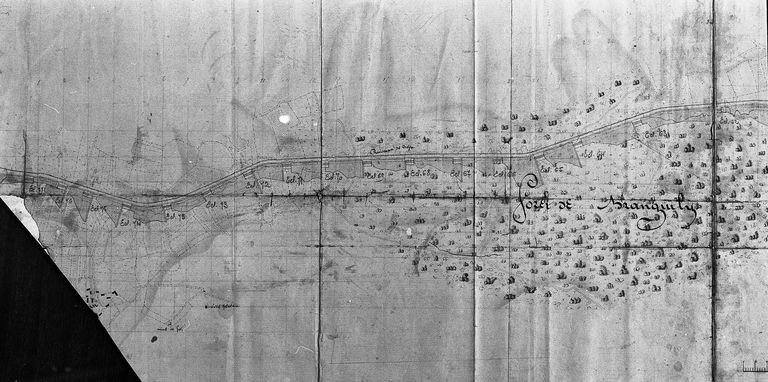[Communication de l'Oust au Blavet. Extrait d'une carte montrant l'aménagement du canal entre les écluses n° 55 et 77 le long du ruisseau de Boju, et une partie de la rivière d'Oust, faisant office de limite départementale]. Carte, [s. n. ; s. d.]. Papier, encre, aquarelle, 31x112 ; échelle : 1 : 5000.
