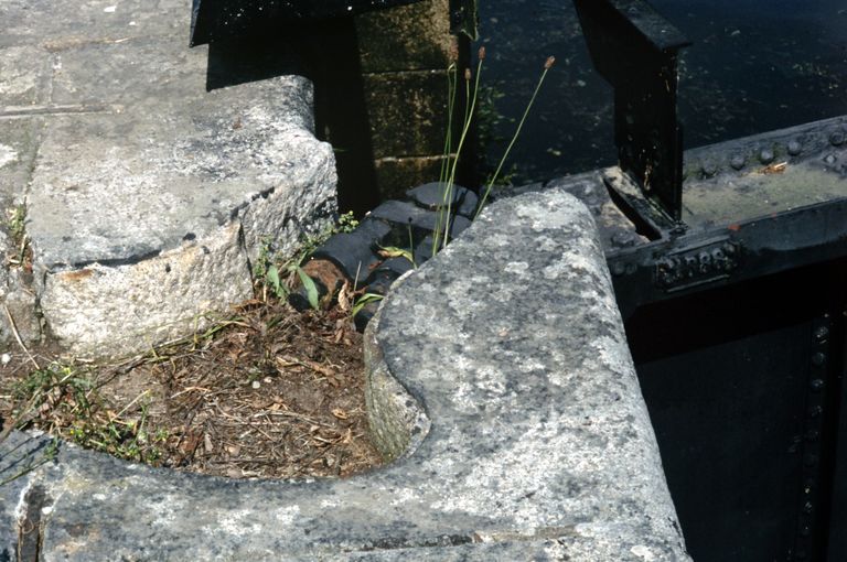 Écluse à sas ; pierre de taille de granite ; bittes d'amarrage.