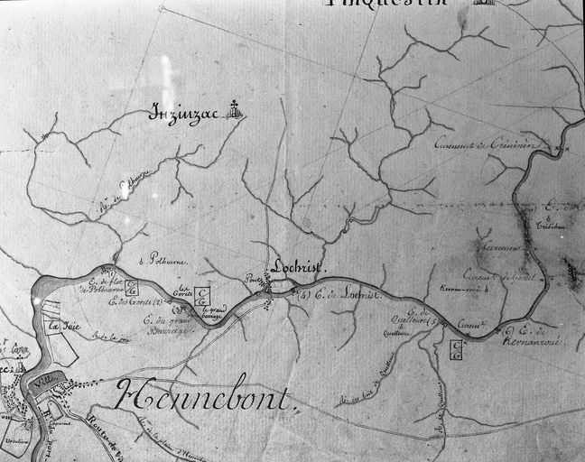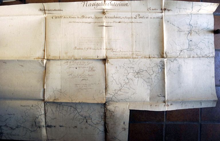Navigation intérieure. Rivière du Blavet. Département du Morbihan (ci devant Bretagne). Plan de la Rivière du Blavet depuis le Guerne commune de Pluméliau jusqu'à St-Michel. Carte, par Guy Bouëssel, ingénieur des Ponts et Chaussées, brumaire an XIII [octobre 1804]. Papier, encre, aquarelle.