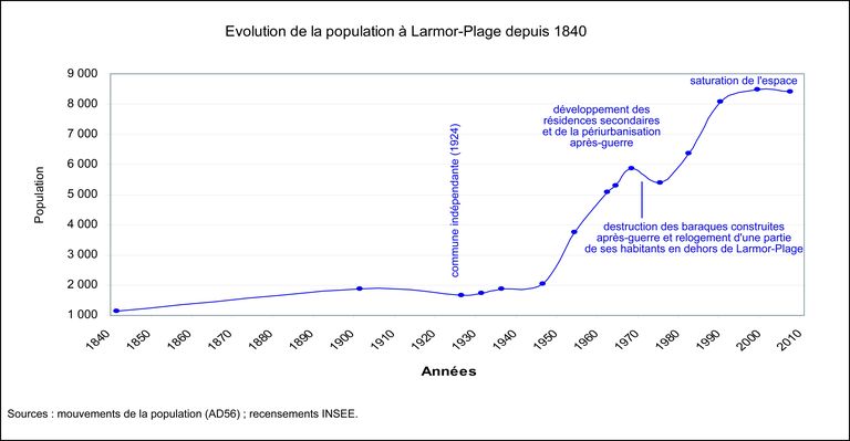 Après cet épisode difficile, les années 1950 sont celles des changements. Victime des bombardements alliés sous la Seconde Guerre mondiale, Larmor-Plage se reconstruit. Le nombre d´exploitations agricoles ne cesse de diminuer, alors que leur taille augmente. Les pratiques de pêche changent, l´appauvrissement des ressources oblige de nouveaux bateaux, les chalutiers, à pêcher toujours plus loin des côtes. Les conserveries de Larmor-Plage cessent de fonctionner. Leur emplacement est réutilisé pour la construction de villas balnéaires. C´est aussi une période de forte hausse de la démographie, liée à l'installation de populations suite à la destruction de Lorient puis par périurbanisation autour de la grande cité portuaire voisine. Les années 1960-1970 sont marquées par un essor du tourisme et du développement des résidences secondaires, alors que la grande majorité de la population active va travailler hors de la commune. La tendance ne faisant que se renforcer en ce début de 21e siècle, avec en plus, l´accueil d´une forte population de retraités.
