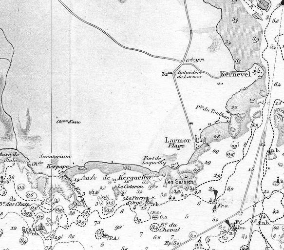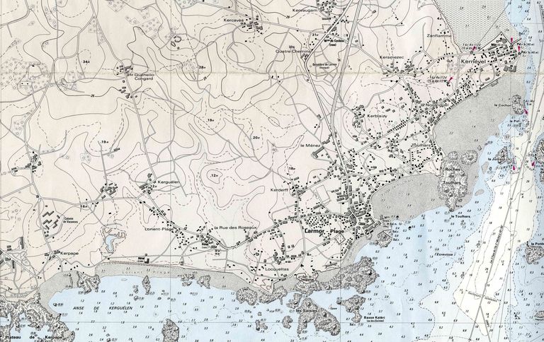 Le déclenchement de la Seconde Guerre mondiale et la décision d´Hitler de faire de Lorient la principale base d´attaque sous-marine de l´Atlantique mettent Larmor-Plage au coeur d´un vaste dispositif militaire à partir de 1940. Le vieux fort de Locqueltas est armé d´une batterie côtière appuyée par les pièces d´artillerie de l´ancienne batterie du Kernevel puissamment réarmée. Les trois belles villas qui dominent l´espace portuaire du Kernevel sont elles investies par le poste de commandement des sous-marins allemands basés dans l´Atlantique.