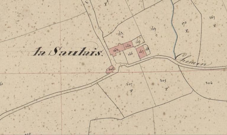 - L’hébergement de la Saulaie, à Jean Dompoual (ou Soual, plus vraisemblable en raison du toponyme), dont le plan cadastral montre un édifice à tour postérieure. Toujours à la famille de Soual ou de la Souallaye, l’endroit est encore signalé comme manoir en 1666. Les nombreux remaniements qui ont affecté la partie ouest et la reconstruction de la partie est au début du 19e siècle (cependant, l’élévation nord conserve des ouvertures anciennes), empêchent, en l’absence de visite intérieure, de reconnaître les éléments subsistant du manoir.