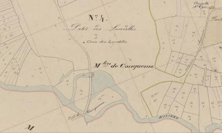 - Du manoir de Canquémar appartenant à Guillemette de Canquémar, ne subsistait sur le plan cadastral de 1840 que le logis avec tour carrée sur l'angle, disparue, ainsi que le moulin, très éloigné, établi sur une dérivation de l’Arz, aujourd’hui détruit : la famille de Canquémar s’est fondue dans Cancouët dès le milieu du 15e siècle. Elle possédait aussi l’hébergement noble de la Foye, disparu, qui consistait sur le plan de 1840 en deux bâtiments parallèles orientés est-ouest.