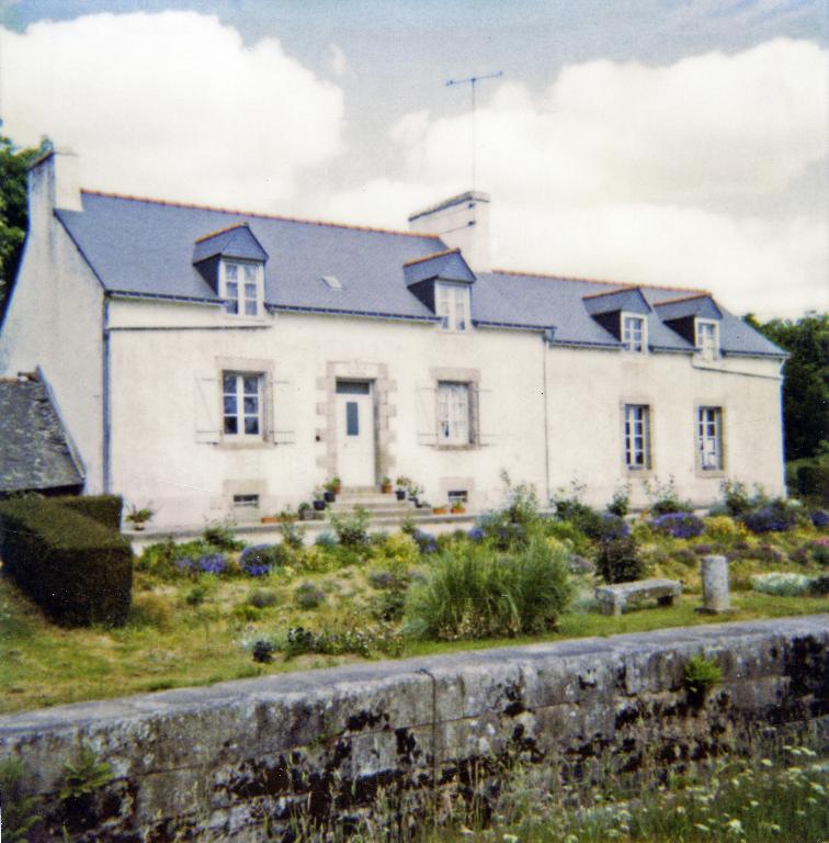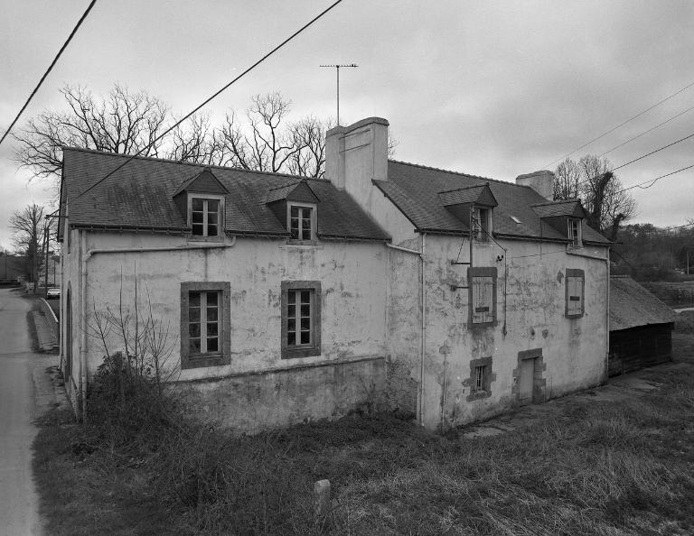 Logis : plan de type ternaire en rez-de-chaussée ; niveau de soubassement, rez-de-chaussée surélevé, comble à deux lucarnes sur chaque façade ; fenêtres de grandes dimensions ; murs : moellons de grès, schiste et granite enduits ; perron et encadrements des baies harpés (facade antérieure) : pierre de taille de granite ; lucarnes à cadres de bois ; deux souches de cheminée. Dépendance sous le logis (accès par la façade postérieure) : étable ou espace de stockage ; une porte, une fenêtre carrée ; encadrements des baies harpés : pierre de taille de granite. Deux dépendances de part et d'autre du logis ; à gauche, un hangar : bois ; toits à longs pans ; à droite, un magasin général : rez-de-chaussée ; comble à deux lucarnes sur chaque façade ; grande porte cintrée dans le mur pignon. État actuel : toitures refaites.