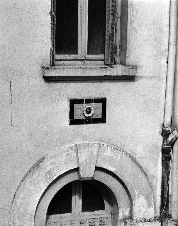L'enseigne des bains-douches sur fond turquoise ; cabochons et rosaces en céramique émaillée.