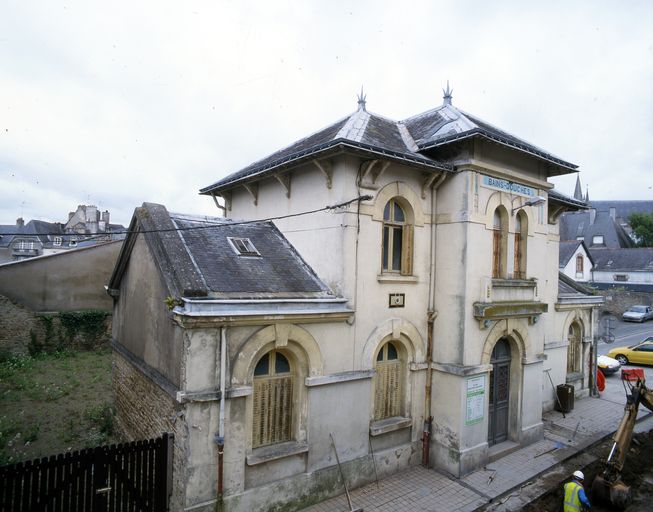 A l'époque où les salles de bains domestiques sont des aménagements encore rares, il existe à Vannes six établissements de bains-douches. Cinq sont réservés à des collectivités : casernes (3), école normale d'institutrices, collège communal ; le sixième, privé, est ouvert depuis 1864 rue du Mené (à la place du cinéma Le Royal, aujourd'hui librairie Cheminant), en remplacement de celui en place sur les courtines dépendantes du château de l'Hermine (cadastre de 1844). Raccordé au nouveau réseau d'adduction d'eau, il est alors considéré comme un établissement luxueux. Cependant, en raison de sa capacité limitée à 2000 bains annuels, la ville dont la population dépasse les 23700 habitants décide la construction de nouveaux bains-douches le 9 décembre 1912 afin de "contribuer à l'amélioration de la santé publique en assurant l'hygiène des habitants de la ville...suivant les derniers perfectionnements existant dans ce genre de construction". C'est une entreprise parisienne qui propose les plans des bains-douches municipaux prévus rue des Remparts à l'arrière de la toute nouvelle halles des Lices. Le choix se porte se porte sur une installation moderne dotée de sept cabines de bains et huit cabines de douches, dont cinq côté hommes. Ouvert au public en 1923, l'établissement a fonctionné pendant soixante ans.