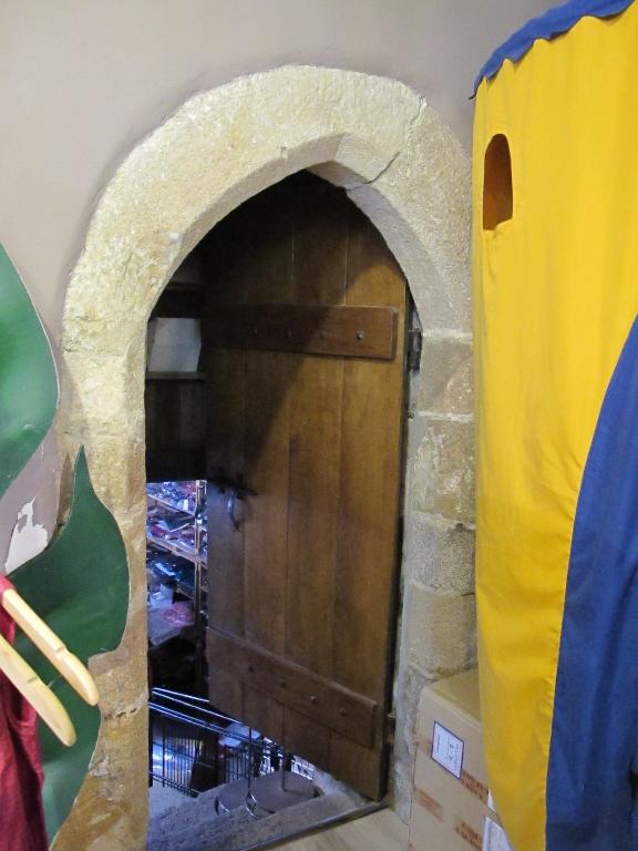 Pour compenser la différence de niveau entre les deux édifices, le corps postérieur et la cage d'escalier sont bâtis en légère surélévation correspondant pour la maison d'angle au plafond de son sous-sol accessible depuis la boutique. Le premier étage de ce corps postérieur communique avec un petit édifice construit au 17e siècle sur le bastion par un passage vouté ancien creusé dans le mur d'enceinte. Depuis cet endroit, on peut observer encore en place les machicoulis anciens du mur d'enceinte élevé avant la construction du bastion.
