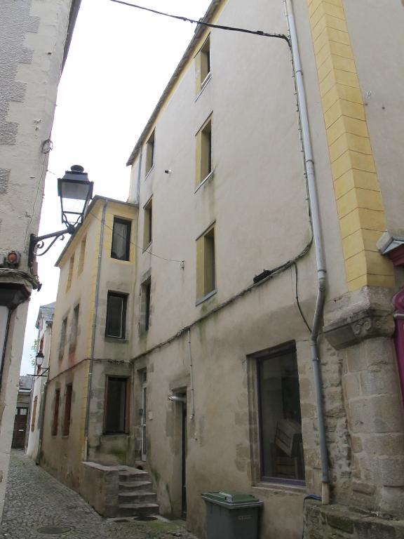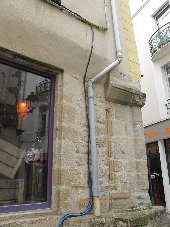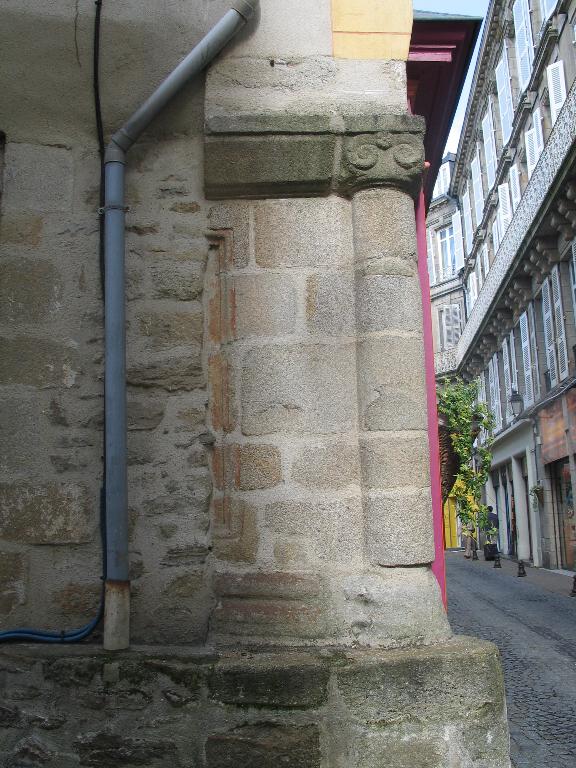 Concernant la maison d'angle, des éléments encore en place sur la façade et à l'intérieur : colonne d'angle surmontée d'un chapiteau, vestiges polychromes d'encadrements d'une ouverture et vestige d'étal de boutique, arc-brisé de la porte du mur ouest dans la boutique intérieure, cheminée du premier étage, indiquent la présence d'un édifice ancien pouvant remonter au 15e siècle. L'enduit actuel des façades dissimule de plus une structure ancienne en pan de bois avec coyer d'angle pour soutenir son avancée. L'absence de cette maison dans le rentier ducal de 1455-1458, car construite sur le fief de l'évêque, ne nous permet pas de vérifier l'existence d'une construction à cette date et d'en connaître les propriétaires. Peut-être s'agit-il du corps de garde de la porte du Bali située à cet endroit.