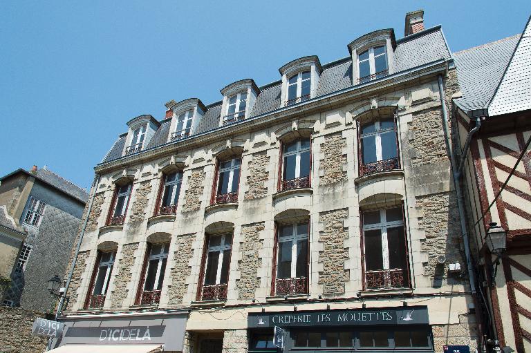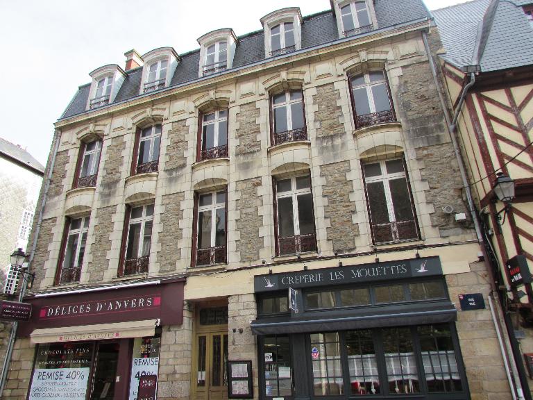 Immeuble daté par le cadastre numérisé 1905 ; ce qui correspond à l'architecture de la construction. L'immeuble est construit sur l'emplacement de 2 anciennes parcelles dont une laniérée, visibles et construites sur le cadastre de 1844. Un négatif photographique du fonds Auguste David (1890-1925) montre trois édifices sur ces deux parcelles ; ce qui correspond bien aux informations délivrées par les archives de la réformation. Cet ensemble de trois bâtis, démolis aujourd'hui, joignaient par l'arrière, ceux de la place des Lices, comme l'indiquent les archives du 17e siècle qui mentionnent Jacques Choumin, marchand et Yves de la Couldraye, propriétaires. La boutique de la maison construite sur la parcelle K8 1890 cadastre de 1844 est louée en 1676 à Philippe Heuzé traiteur, cuisinier et cabaretier.