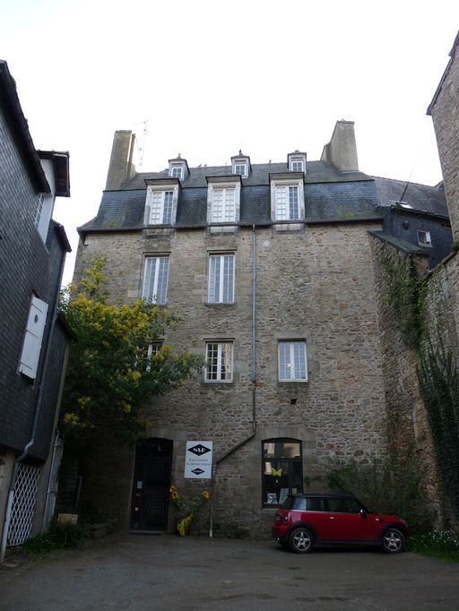 Descendus tous de compagnie dans un appentis entre cette maison et une autre appartenante aussi au dit Sr de Montigny de son acquêt des Srs Gillot et consorts, le dit expert nous a fait voir que le dit appentis porte de face 8 pieds 6 pouces et de profondeur y compris l´épaisseur du mur de face 18 pieds que dans le fond de l´appentis se trouve une fosse d´aisance dépendant de la maison côtière, que le mur de la dite fosse d´aisance est distincte et séparée du celui qu´on nous a dit estre le mur de la fosse d´aisance de la maison du dit Sr Le Mintier et qu´il ne se trouve aucune communication entre les dites fosses d´aisance, que sur le dit appentis il existe un mur sur lequel est construit une goutière partie en ardoises et partie en plomb servant à l´écoulement des eaux de la maison du Sr de Montigny donnant sur les Lices et portant l´écoulement des dites eaux dans la cour d´une maison voisine appartenant au Sr du Guernic, et qu´au surplus la maison du dit Sr Le Mintier n´a aucun écoulement ni d´égoût d´eau sur les maisons et appentis du dit Sr de Montigny.