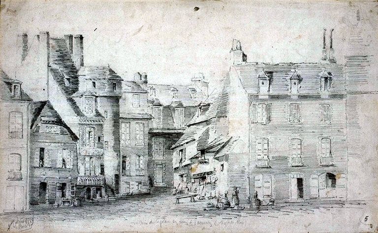A. D. Morbihan 2 Fi 5. Le coin de la place des Lices par J. Le Roch, 1859.