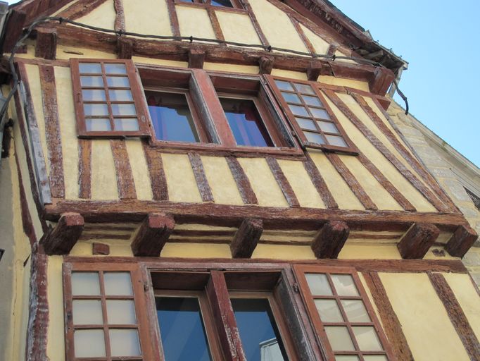 Maison non alignée construite sur une parcelle oblique de type "laniéré". Le corps principal en pan de bois, à pignon sur rue et encorbellement, est double en profondeur, composé de deux pièces par niveau. Maison à travée unique sur un soubassement maçonné de 2 étages carrés et étage de comble avec sous-sol. La charpente est à poteaux réguliers avec décharges latérales et croix de Saint-André en allège. La porte d'entrée de la maison est latérale et donne accès à un couloir en place sur à peu près la moitié de l'édifice et au fond duquel démarre l'escalier.