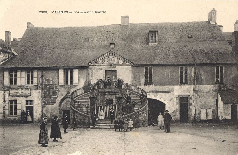 A.M. Vannes 1M50. Ancienne mairie : 1792-1945. Correspondance, travaux, réparations. Plan couleur de l'escalier. Etablissement de latrines. Refonte de la cloche de la tour de l'hôtel de la mairie. Monuments historiques : transfert de l'ancien escalier dans la cour de l'hôtel de Limur.