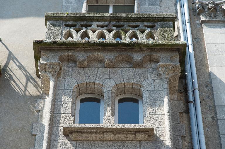 Le support de l'oriel est décoré de motifs d'acanthe. Ferronnerie pour les balcons filant.