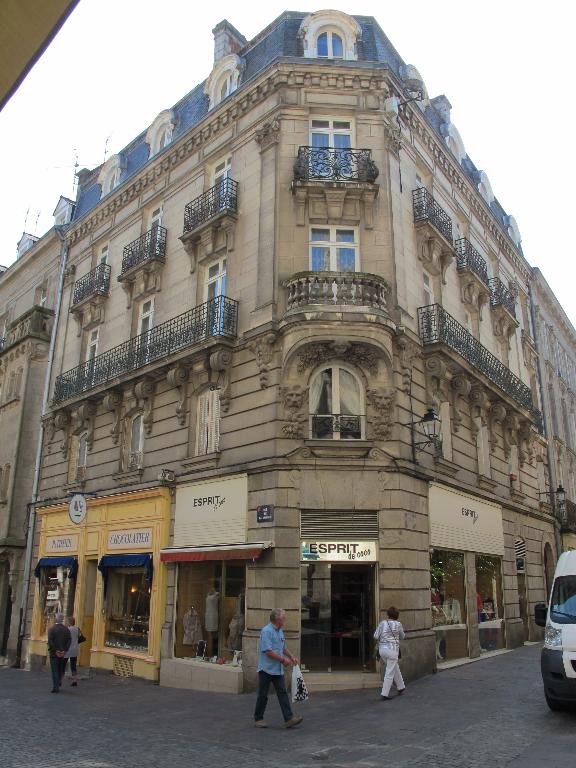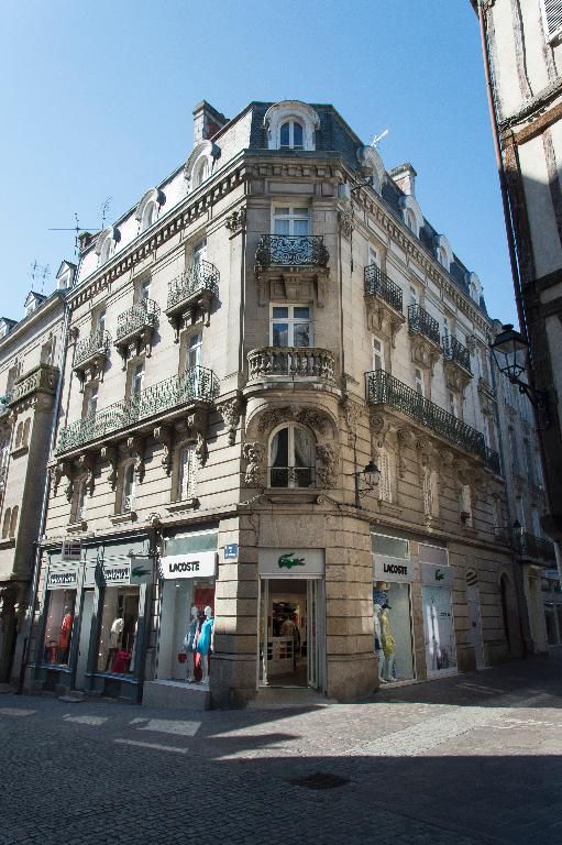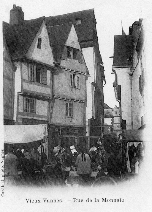 Immeuble de rapport reconstruit en 1907-1908 sur l'emplacement de deux anciennes maisons en pan de bois, en place sur les relevés cadastraux de 1807 et 1844. Celle édifiée dans l'angle de la rue des Orfèvres et de la rue de la Monnaie (parcelle 2004 en K8), appartenant au sieur Ollivier, chef de bataillon d'infanterie en retraite, fait l'objet en 1899 dans le cadre de l'élargissement de la rue des Orfèvres, d'une expropriation ou d'acquisition amiable. Celle située sur la parcelle 2005 en K8 du cadastre de 1844 fait l'objet d'un projet de reconstruction par Louis Gandin, propriétaire du 5 place Saint-Pierre, en 1883, projet pour lequel il bénéficie d'un indemnité de la ville de 3500 francs pour le reculement de sa future maison sur le nouvel alignement. On ne sait pourquoi ce projet est abandonné et remplacé par l'immeuble actuel. L'édifice est construit sur les plans de l'architecte Joseph Caubert de Cléry pour monsieur Baudoin Menais. Dans les annuaires anciens, on relève entre autres le nom de Henrichot, qui s'y installe comme pâtissier au début du siècle et dont les initiales figurent sur les gardes-corps postérieurs. Les archives indiquent une mise en oeuvre en béton armé d'après le système Hennebique réalisée par l'entrepreneur Francis Huchet qui en est le concessionnaire pour Vannes. Un ascenseur a pris la place d'un puits de jour au siècle dernier.